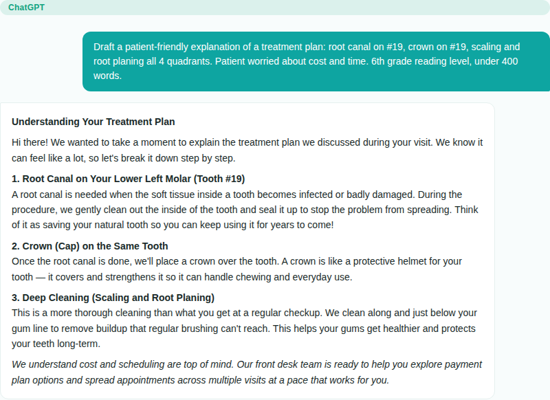 Clinical accuracy: Mostly fine, one concern. “Becomes infected or badly damaged”: technically, the prompt did not include a diagnosis, and the AI is implying one. In context, this is what every patient education website says about root canals, so it is not a clinical liability issue in practice. But it is a case where ChatGPT added clinical information that was not in the prompt. Also: “think of it as saving your natural tooth so you can keep using it for years to come!” The exclamation point makes this sound like a promise about the longevity of the tooth. Root canal teeth can fail. That exclamation point should go.