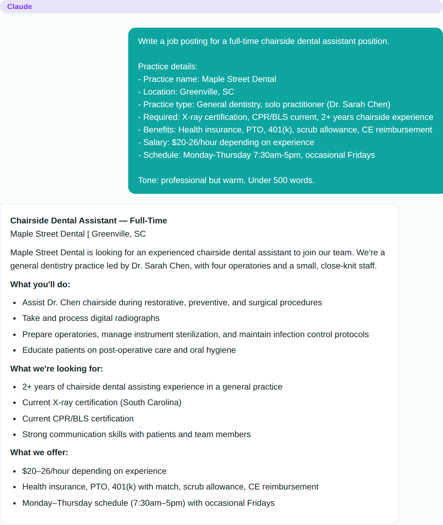 Hiring a dental assistant or hygienist is one of the most time-consuming tasks for a solo practice owner. We used Claude to draft job postings, screening questions, and onboarding checklists for three common dental roles. The job postings were genuinely good. The screening questions were hit-or-miss. The onboarding docs need heavy customization. Here's everything, unedited.