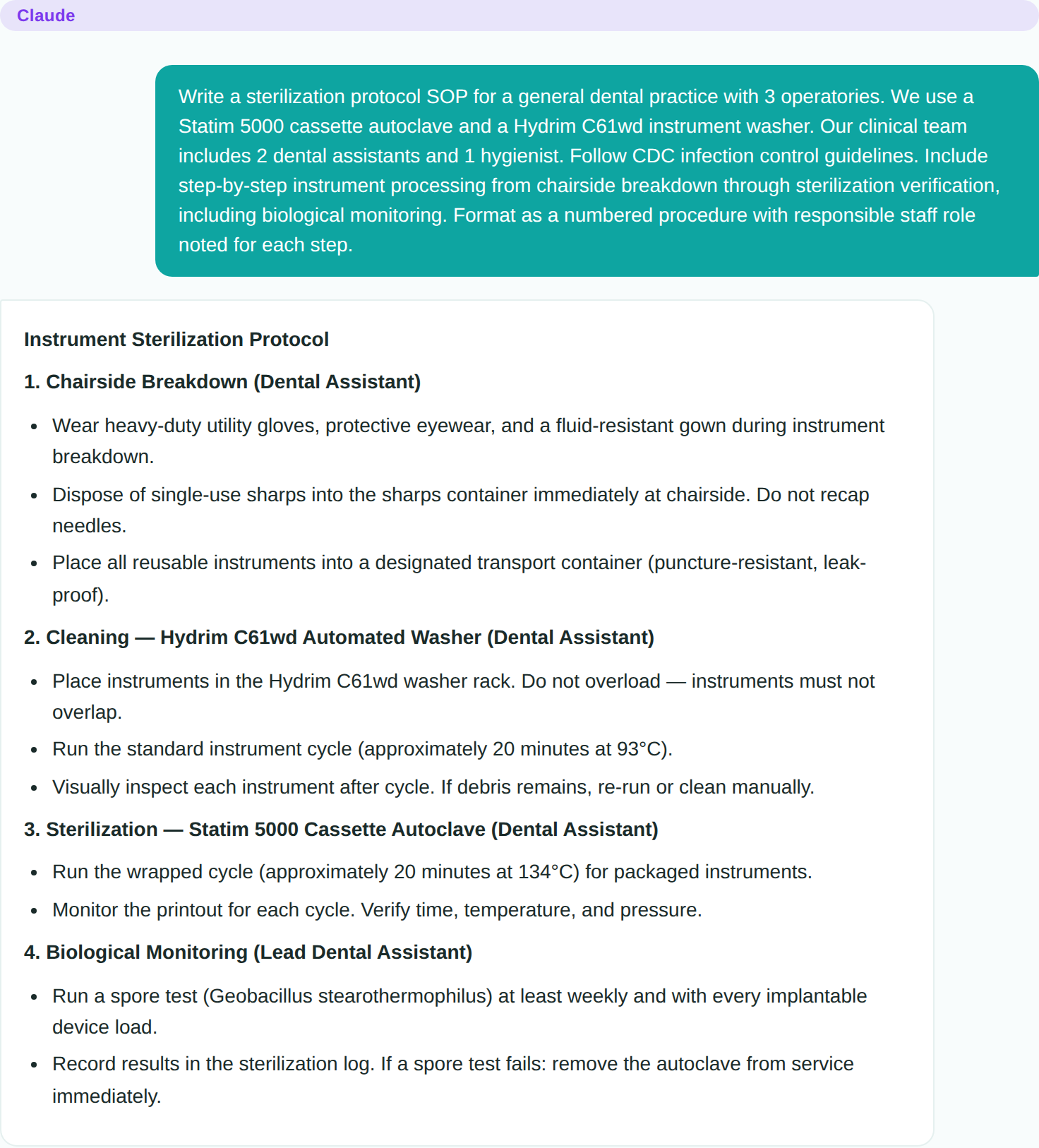 This article was written using publicly available CDC, OSHA, and OSAP documentation and the author’s experience with AI text generation tools. The AI outputs shown above are actual unedited outputs from Claude and ChatGPT respectively. They were generated using the exact prompts shown and were not cherry-picked from multiple attempts. We have not tested these specific SOPs in a working dental practice. The outputs are presented as starting points for drafting, not as ready-to-implement procedures. Any practice implementing SOPs based on AI-generated drafts should have them reviewed by their compliance officer, infection control coordinator, or consulting dental attorney before putting them into use.