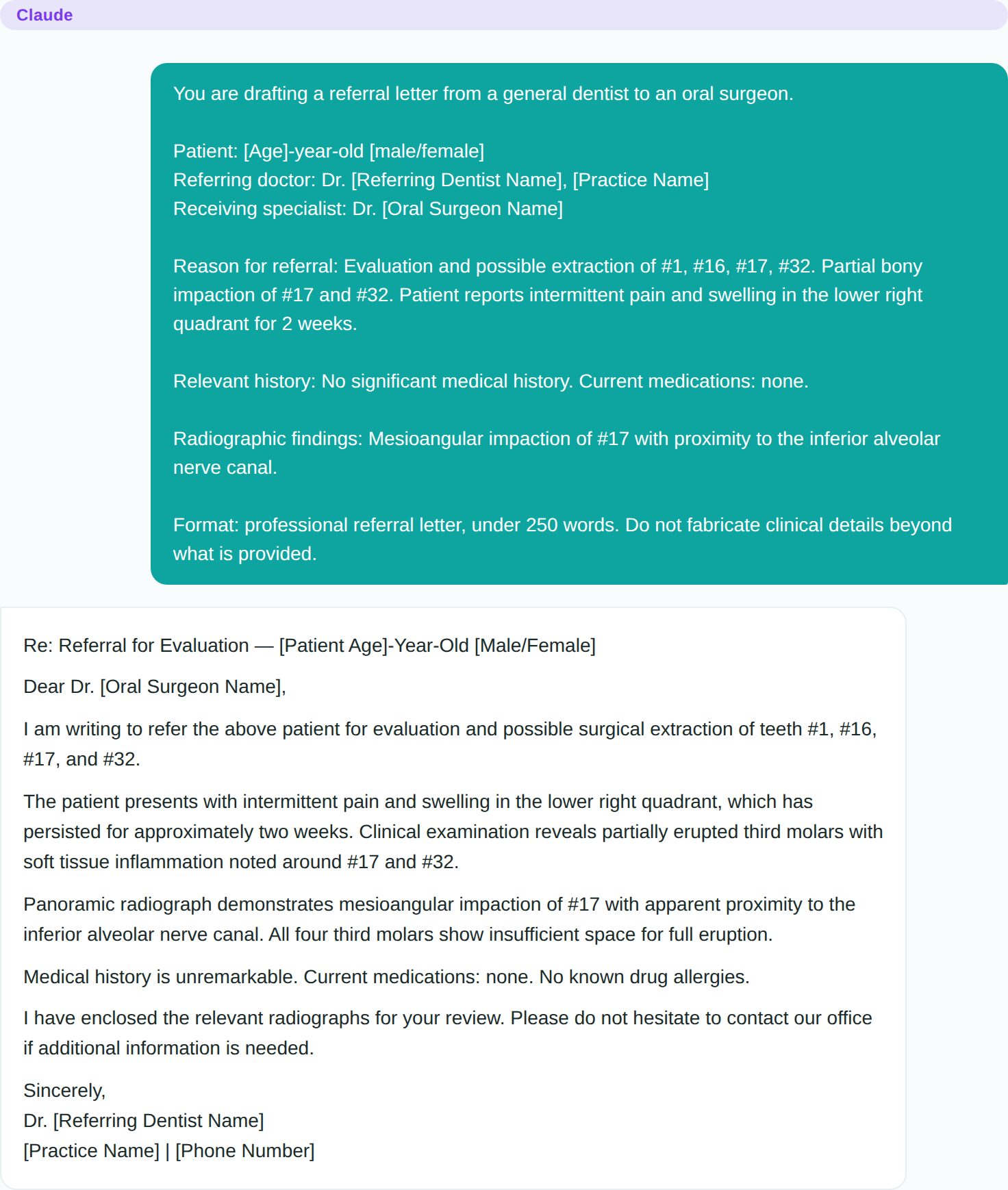 Assessment: The structure matches what oral surgery offices expect to receive. The AI correctly preserved the placeholder format rather than inventing clinical details. The IAN proximity note is clinically relevant; oral surgeons specifically want this flagged. A referring dentist would need to attach actual radiographs and fill in the patient specifics, but the letter itself is ready after that.